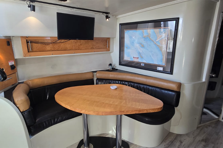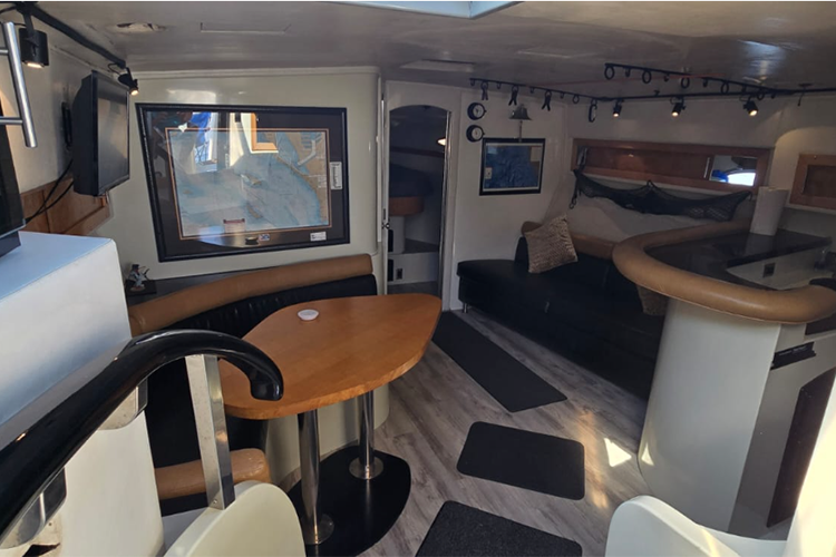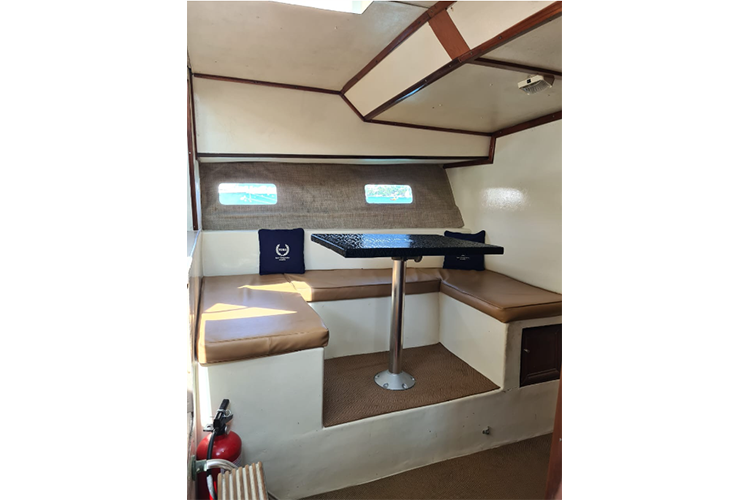 La embarcación cuenta con 2 camarotes, baño con regadera, sala, batanga, 2 snorkel, audio Bluetooth y AIRE ACONDICIONADO.