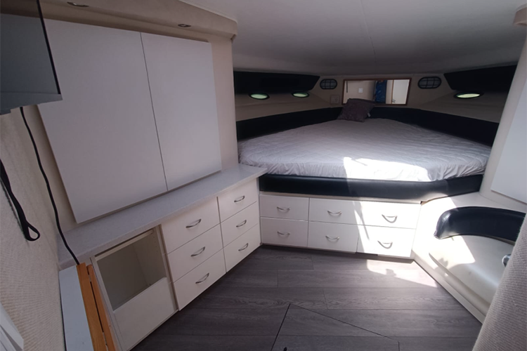 El barco cuenta con 2 camarotes, 2 baños, sala, sonido Bluetooth. No tiene aire acondicionado.